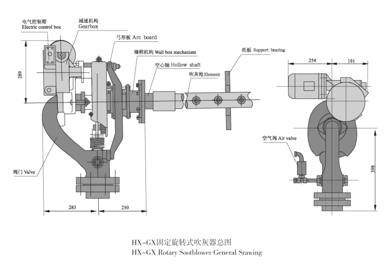 HX-GX吹灰器主要由鵝頸閥、空心軸、吹灰槍、減速傳動(dòng)機(jī)構(gòu)與弓形板、電氣控制箱、爐墻接口裝置、爐內(nèi)托板 等組成。