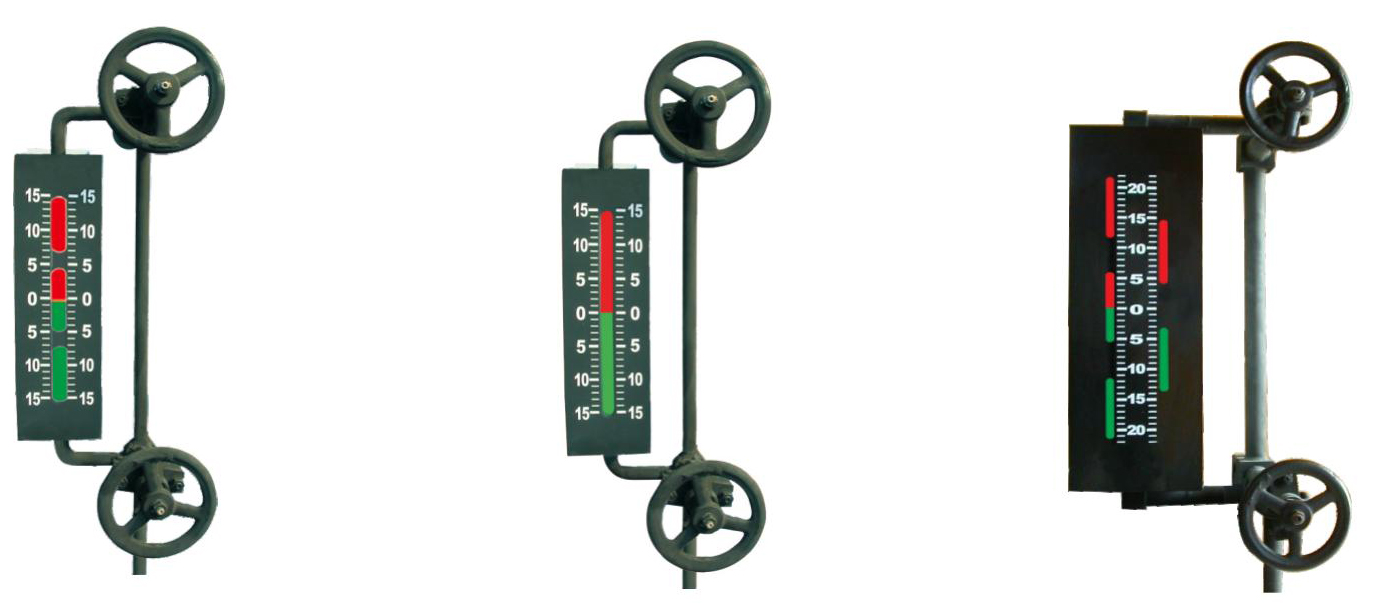 五窗、七窗、九窗水位表觀察孔在表體的兩條直線上,通過將觀測孔交錯組合消除了中間盲區(qū)。由光源發(fā)出的光通過紅、綠濾色鏡片,射向水位表體液腔,在表面內(nèi)汽相部分,紅光射向正前方,而綠光斜射到壁上被吸收。而在表體內(nèi)液相部分,由于水的折射使綠光射向正前方,而紅光斜射到壁上被吸收。因此在正前方觀測將獲得汽紅、水綠、汽滿全紅、水滿全綠的顯示效果。
