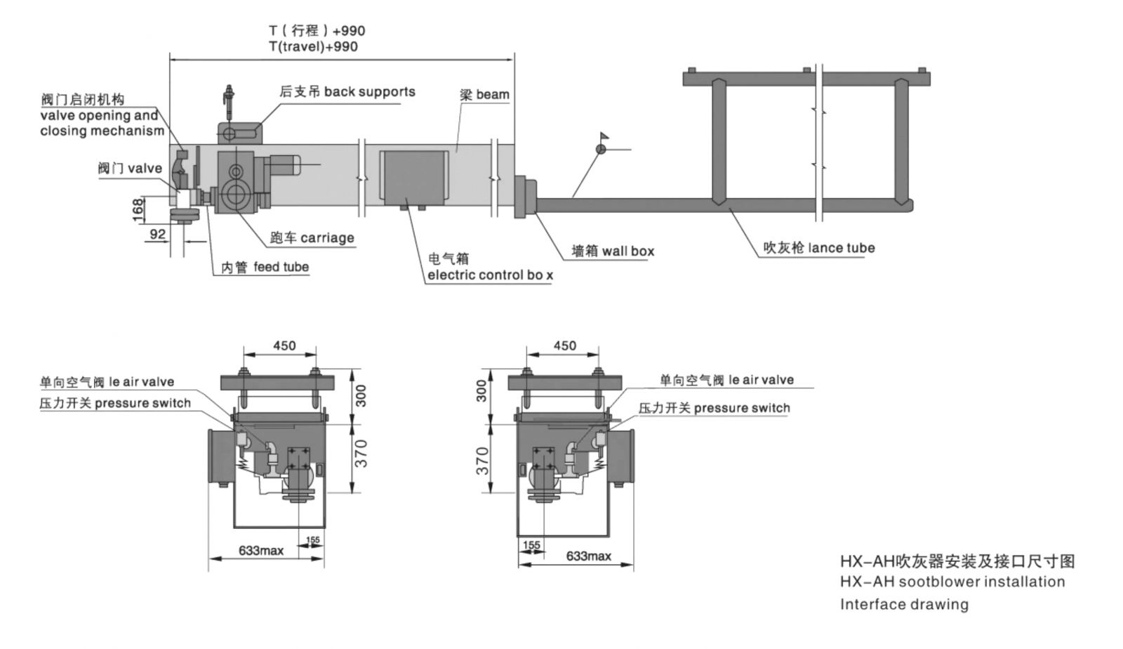 HX-AH型吹灰器主要由跑車(chē)、提升閥、梁體、墻箱、內(nèi)管、吹灰槍與噴嘴、電氣箱與控制等組成。